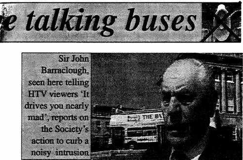 The Chief preoccupation in recent months has been the topless talking buses. We have sustained our reaction in every way we could and the press and TV publicity has given us a good platform from which to continue the offensive. We have been in correspondence with the City and County Councils and the Traffic Commission as well as our MP. It is a complex problem stemming from the deregulation of buses under the 1985 Act. Maddening as the commentaries are, the sheer weight and diesel pollution that these vehicles are bringing to bear on the Crescent is an even greater concern. Regrettably, the law is not helpful, but we are continuing to explore the possibilities and our Local Authorities are not unsympathetic. This is not the place for detail and I ask our members to accept that the Committee has been, is, and will continue to be, active and persistent in the matter. Top of Page / Go to Buses Part 2 / Go to Buses Part 3